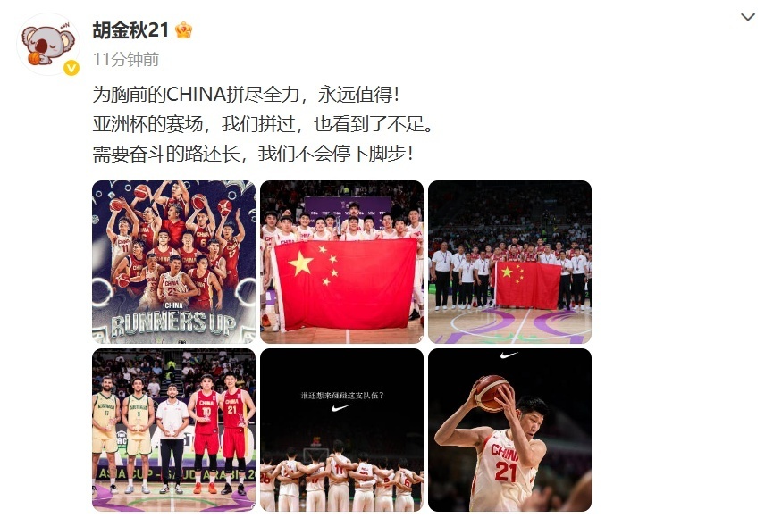 胡金秋发文:为胸前的CHINA拼尽全力,永远值得!亚洲杯的赛场,我们拼过,也看到了不足。需要奋斗的路还长,我们不会停下脚步!