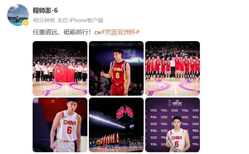 18日下午,胡明轩在社媒晒出亚洲杯中国男篮合影以及多张决赛赛场图。