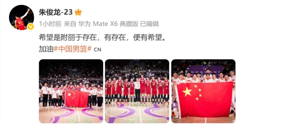 朱俊龙发文:希望是附丽于存在,有存在,便有希望。加油中国男篮。